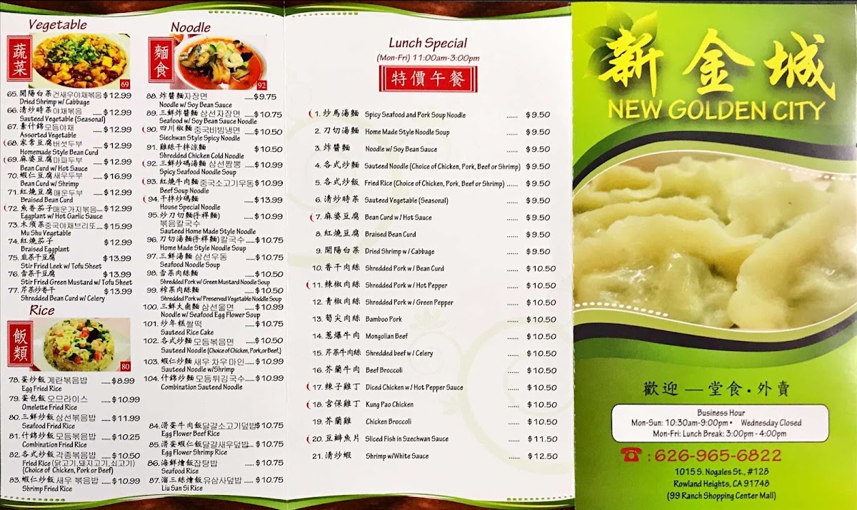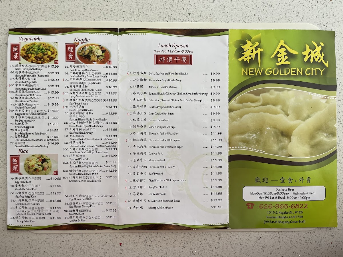 The menu at New Golden City features a variety of Chinese cuisine with a particular focus on dumplings and classic regional dishes. It is organized into several main categories including Beef, Noodles, and Rice, offering a range of choices suitable for casual dining or quick meals.